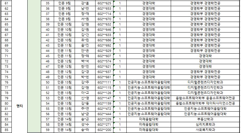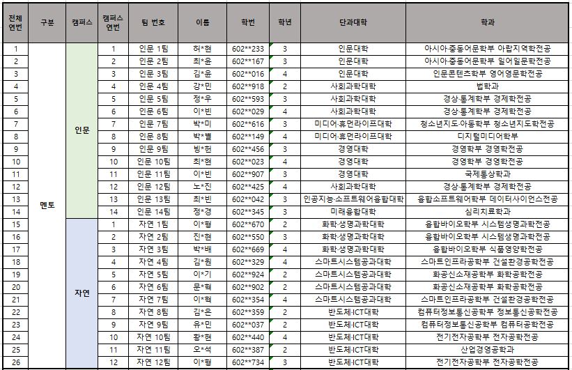 - 총 134명 : 멘토 26명(인문 14명, 자연 12명), 멘티 108명(인문 59명, 자연 49명)
