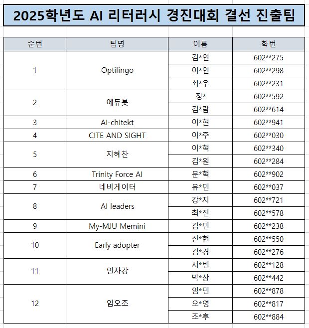 2025학년도 AI 리터러시 경진대회 예선 심사 결과는 아래와 같습니다.