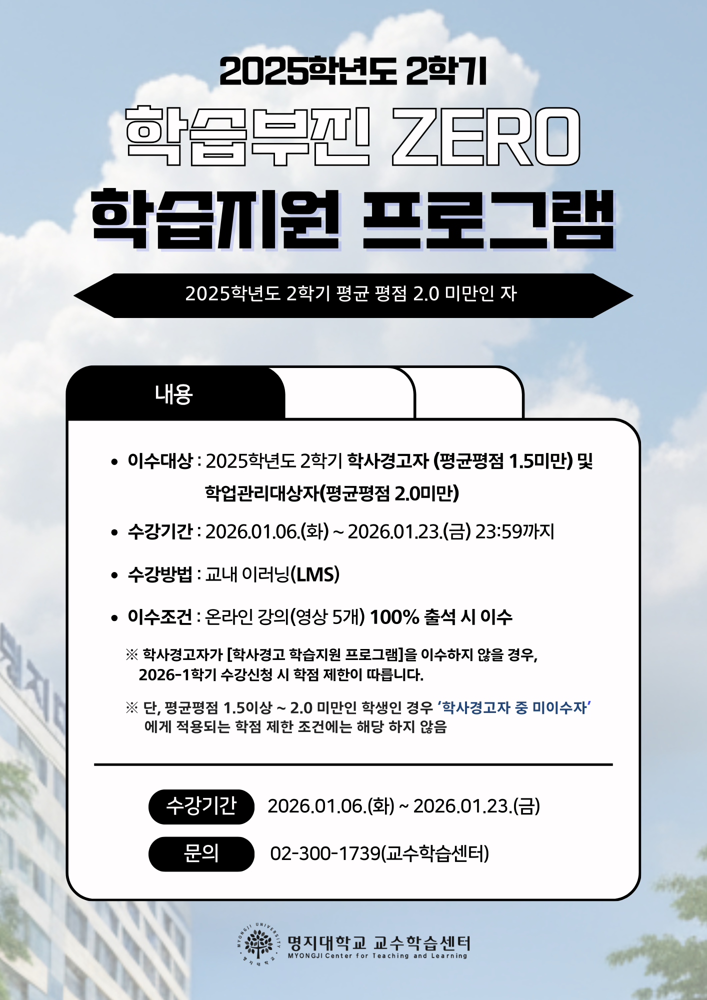 2025학년도 2학기 학습부진 ZERO [학사경고자 학습지원 프로그램] 안내
